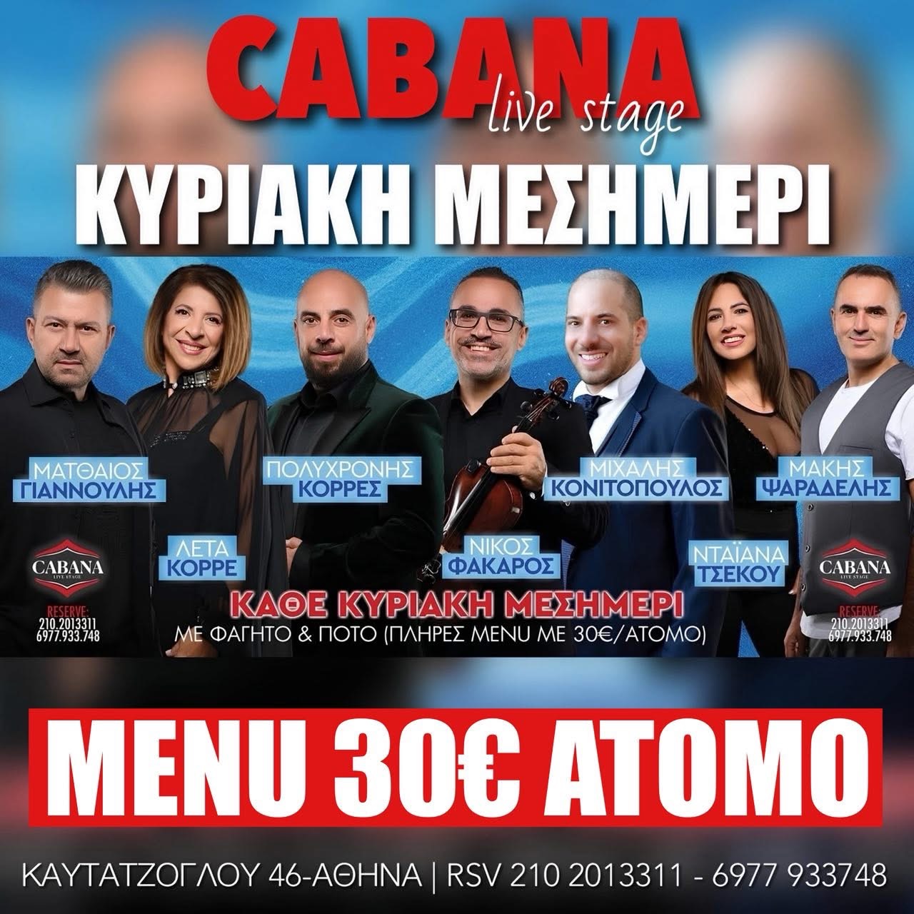 Το κέφι, ο χορός, και οι γεύσεις σε ένα πλήρες μενού ανά άτομο, που θα θυμίζουν Αιγαίο, έρχονται να μας «ταξιδέψουν» μουσικά, στα νησιά μας και όχι μόνο, κάθε Κυριακή, στο Cabana Live Stage! Ενώ κάθε Παρασκευή και Σάββατο, την σκυτάλη της διασκέδασης, κρατούν με επιτυχία, ο Σώτης Βολάνης και η Τζένη Κατσίγιαννη!