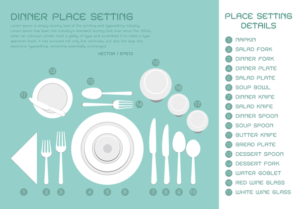 * Μαχαιροπίρουνα: Τοποθετούνται δεξιά κι αριστερά των πιάτων σερβιρίσματος, ενώ το πιρούνι και το κουτάλι για το επιδόρπιο μπαίνουν στην πάνω πλευρά. Για τα μαχαιροπίρουνα του φαγητού τώρα, να θυμάστε ότι αριστερά του πιάτου μπαίνουν τα πιρούνια με τη σειρά -από έξω προς τα μέσα- να έχει ως εξής: πρώτα το πιρούνι για τη σαλάτα και μετά για το κυρίως. Στα δεξιά πάλι τοποθετείτε τα μαχαίρια με τη λάμα τους στραμμένη προς τα πιάτα και τη σειρά επίσης από έξω προς τα μέσα: πρώτα για τη σαλάτα και μετά για το κυρίως. Δίπλα στα μαχαίρια τέλος, τοποθετούνται τα κουτάλια, πρώτα για τη σούπα και μετά για το τσάι.