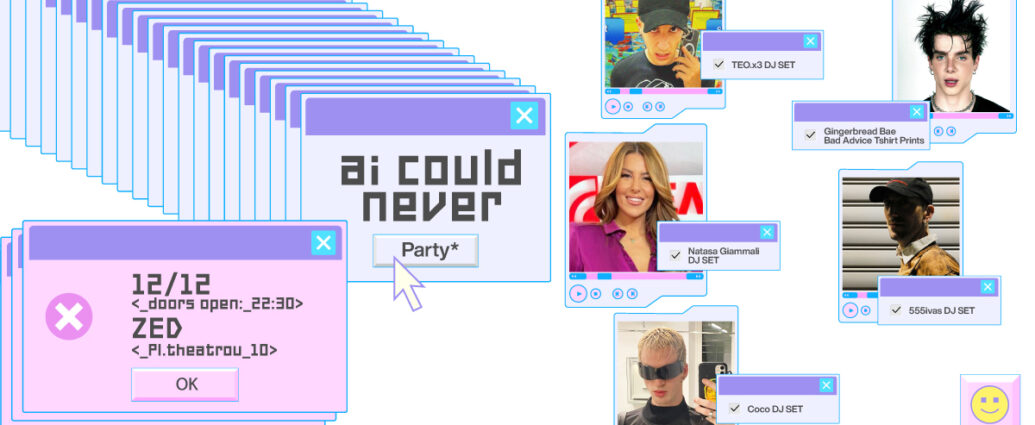Για να το γιορτάσουμε, στις 12 Δεκεμβρίου θα τεστάρουμε ένα real life AI prompt: Βάλε μου τη Νατάσα Γιάμαλη να κάνει το πιο ακραίο electronic dj set. A, και βάλε τον Gingerbread Bae να σου αφιερώνει bad relationship advice γράφοντάς τις στο νέο σου t-shirt. Ok, θα κάνει και ο TEO.x3 το πιο fun hyperpop dj set της ζωής του, αλλά whatever. Μαζί τους COCO & 555ivas με fire dj sets. Ετοιμάσου για ένα experience όπως η ερωτική σου ζωή: ό,τι να ναι αλλά τέρμα fun. Ξέρεις κάτι, έλα for the plot!