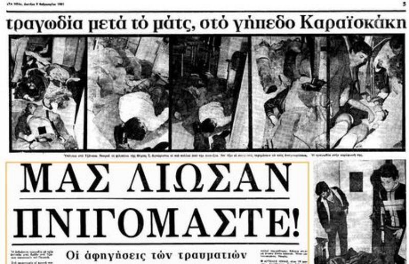 Όλη η Ελλάδα, φίλαθλη και μη, πενθεί. Οι οπαδικές προτιμήσεις υποχωρούν μπροστά στη μεγαλύτερη τραγωδία του ελληνικού αθλητισμού. Το πιο εξοργιστικό γεγονός της όλης ιστορίας είναι ότι μέχρι σήμερα κανείς από τους υπευθύνους δεν έχει λογοδοτήσει για την απίστευτη αυτή τραγωδία. Οι 5 φύλακες της Θύρας 7, που πρωτόδικα είχαν καταδικασθεί σε φυλάκιση 10 ετών, αθωώθηκαν από το Τριμελές Εφετείο Πειραιά στις 22 Σεπτεμβρίου του 1986.