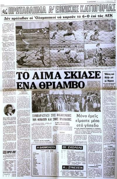 Η τραγωδία εκτυλίσσεται ένα ηλιόλουστο κυριακάτικο απόγευμα στο παλαιό Στάδιο Καραϊσκάκη. Ο Ολυμπιακός των Σαργκάνη, Γαλάκου, Αναστόπουλου και Νικολούδη, αντιμετωπίζει την ΑΕΚ των Αρδίζογλου, Μπάγεβιτς και Μαύρου στο ντέρμπι της 20ης αγωνιστικής του πρωταθλήματος της Α’ Εθνικής. Οι ερυθρόλευκοι είναι καταιγιστικοί… Συντρίβουν 6-0 τους μεγάλους αντιπάλους τους με 3 γκολ του Γαλάκου και από ένα των Κουσουλάκη, Ορφανού και Βαμβακούλα.