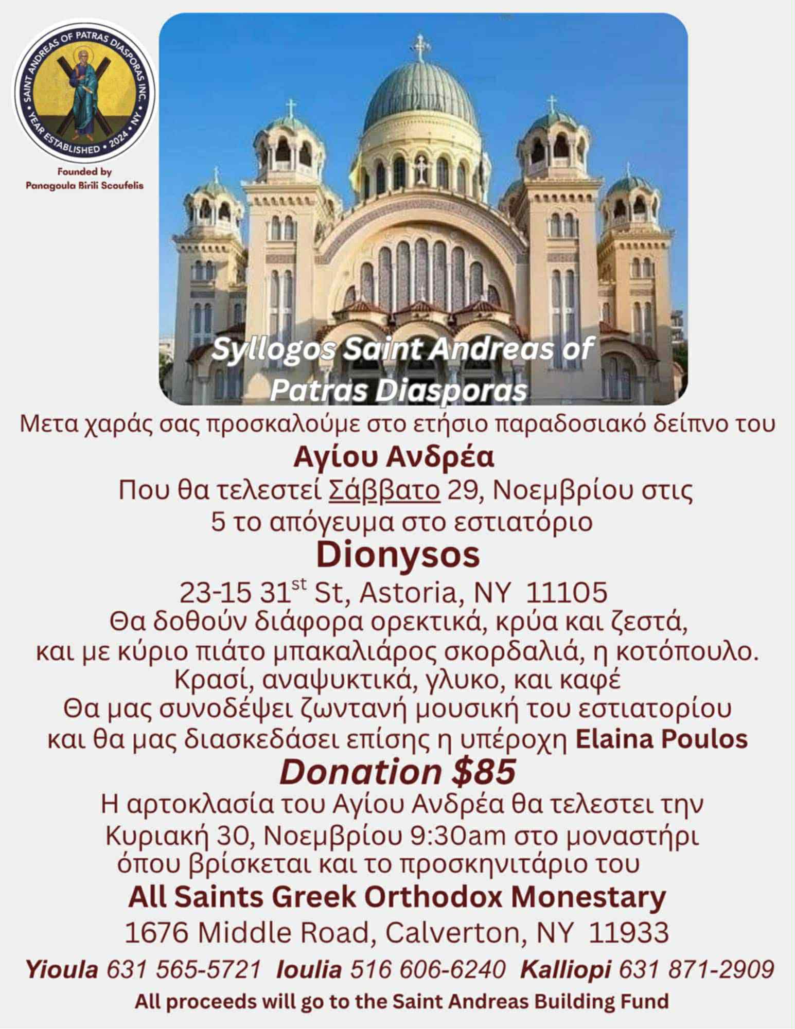 Το παραδοσιακό δείπνο της εκκλησίας του Αγίου Ανδρέα, υπό την διοργάνωση του συλλόγου του Αγίου Ανδρέα- Διασποράς Πάτρας, θα περιλαμβάνει φαγητό, ποτό, γλυκά, αλλά και μουσική, σε ένα μοναδικό γλέντι αλά ελληνικά, που θα παρουσιάσει η Elaina, με σκοπό να συγκεντρωθούν περισσότερα χρήματα, για αυτό τον τόσο ιερό σκοπό. Φυσικά και οι διοργανωτές, δεν θα μπορούσαν να μην την ευχαριστήσουν και δημόσια, αναφέροντάς τη, σε όλα τα διαφημισιτικά τους.