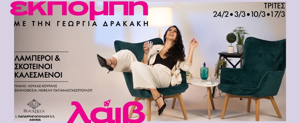 Μία εκπομπή, λοιπόν, που θα ανέβει σταδιακά, επεισόδιο το επεισόδιο, από τα τέλη Μαρτίου στο YouTube, αφού πρώτα θα έχει βιντεοσκοπηθεί με ζωντανό κοινό την Τρίτη 24 Φεβρουαρίου, 3, 10 και 17 Μαρτίου στο Black Duck. Κάθε φορά με διαφορετική θεματολογία , μέσα από το προσωπικό φίλτρο και αισθητική της Γεωργίας Δρακάκη, η οποία θα παντρέψει on stage και live τις ιδιότητές της: συγγραφέας, δημοσιογράφος, τραγουδίστρια.