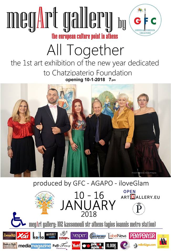 Την Τετάρτη 10 Ιανουαρίου 2018 και ώρα 7:00μμ θα πραγματοποιηθούν τα εγκαίνια της της έκθεσης Τέχνης ALL TOGETHER ( OΛΟI MAZI ) οι Έλληνες & Ξένοι Δημιουργοί GFC θα εγκαινιάσουν το νέο λαμπρό χώρο τους ΜegArt Gallery στην Αθήνα, αγκαλιάζοντας για ακόμη μία φορά τα παιδιά του Χατζηπατέρειου Ιδρύματος με πολυαναπηρία.