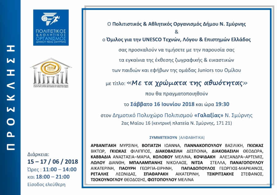 «Με τα χρώματα της αθωότητας» είναι ο τίτλος της ετήσιας έκθεσης ζωγραφικής και εικαστικών, παιδιών και εφήβων, που διοργανώνει για πέμπτη συνεχόμενη χρονιά, ο Όμιλος για την UNESCO Τεχνών, Λόγου και Επιστημών Ελλάδος με τη συνεργασία του Πολιτιστικού & Αθλητικού Οργανισμού Δήμου Νέας Σμύρνης, από 15 ως 17 Ιουνίου 2018, στον Δημοτικό Πολυχώρο Πολιτισμού «Γαλαξίας» Νέας Σμύρνης.