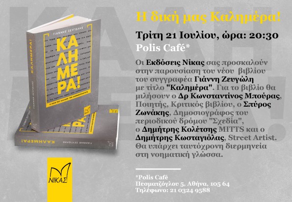 Η παρουσίαση του τέταρτου βιβλίου -κατά σειρά- του συγγραφέα Γιάννη Ζευγώλη θα γίνει την Τρίτη 21 Ιουλίου στο Polis Café όπου θα μιλήσουν: ο Δρ. Κωνσταντίνος Μπούρας, ποιητής-κριτικός βιβλίου, ο Σπύρος Ζωνάκης, δημοσιογράφος του περιοδικού «Σχεδία», ο Δημήτρης Κολέτσης, MITTS, και ο Δημήτρης Κωσταγιόλας, Street Artist.