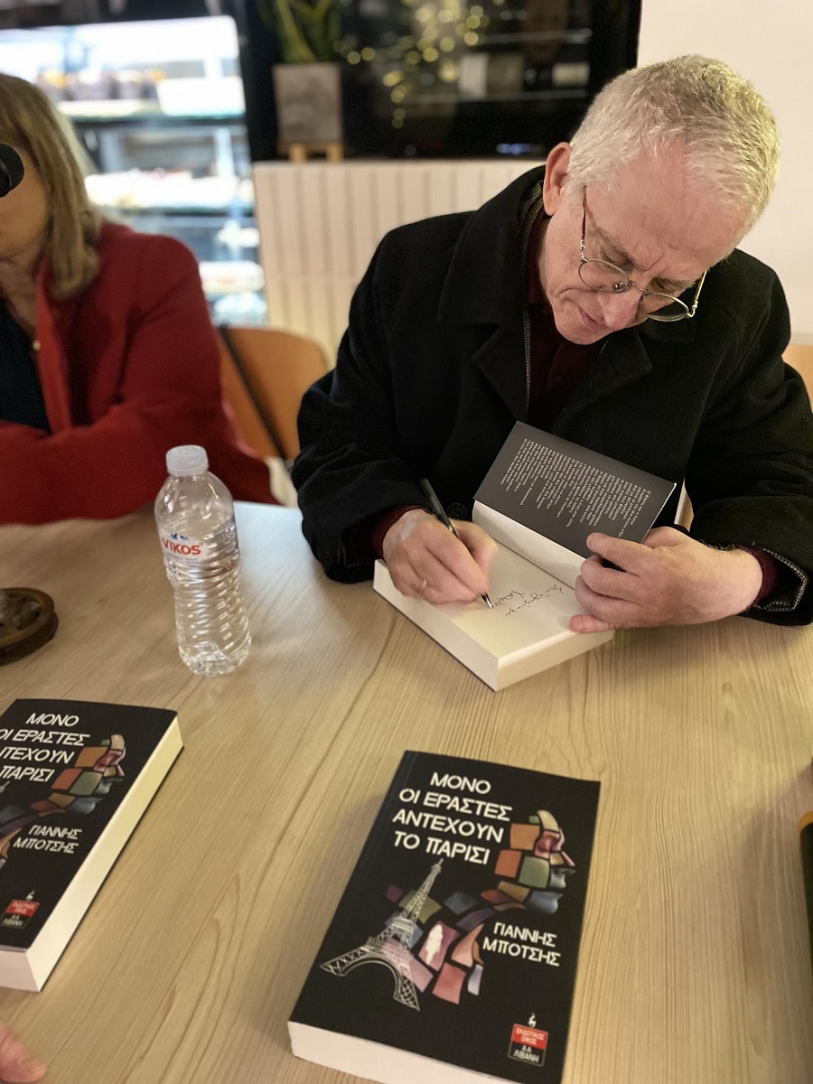 Με τεράστια επιτυχία πραγματοποιήθηκε η παρουσίαση του νέου βιβλίου του Γιάννη Μπότση με τίτλο «Μόνο οι εραστές αντέχουν το Παρίσι» στο ατμοσφαιρικό καφέ «Pair Acropoli» – μόλις λίγα μέτρα από το μετρό της Ακρόπολης – τη Δευτέρα 11 Δεκεμβρίου 2023.
