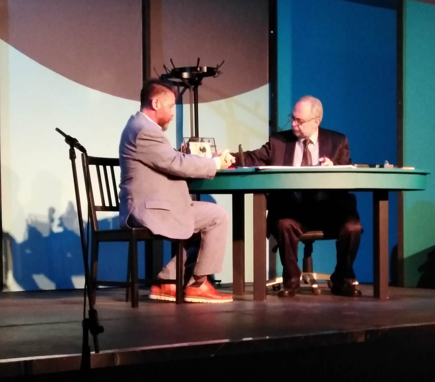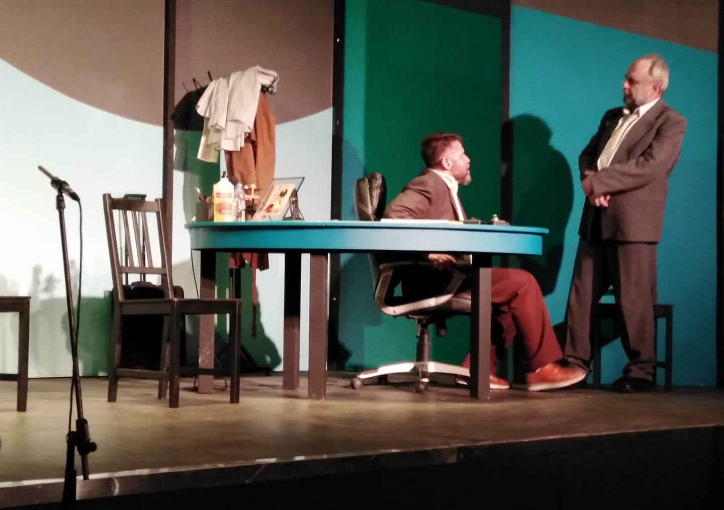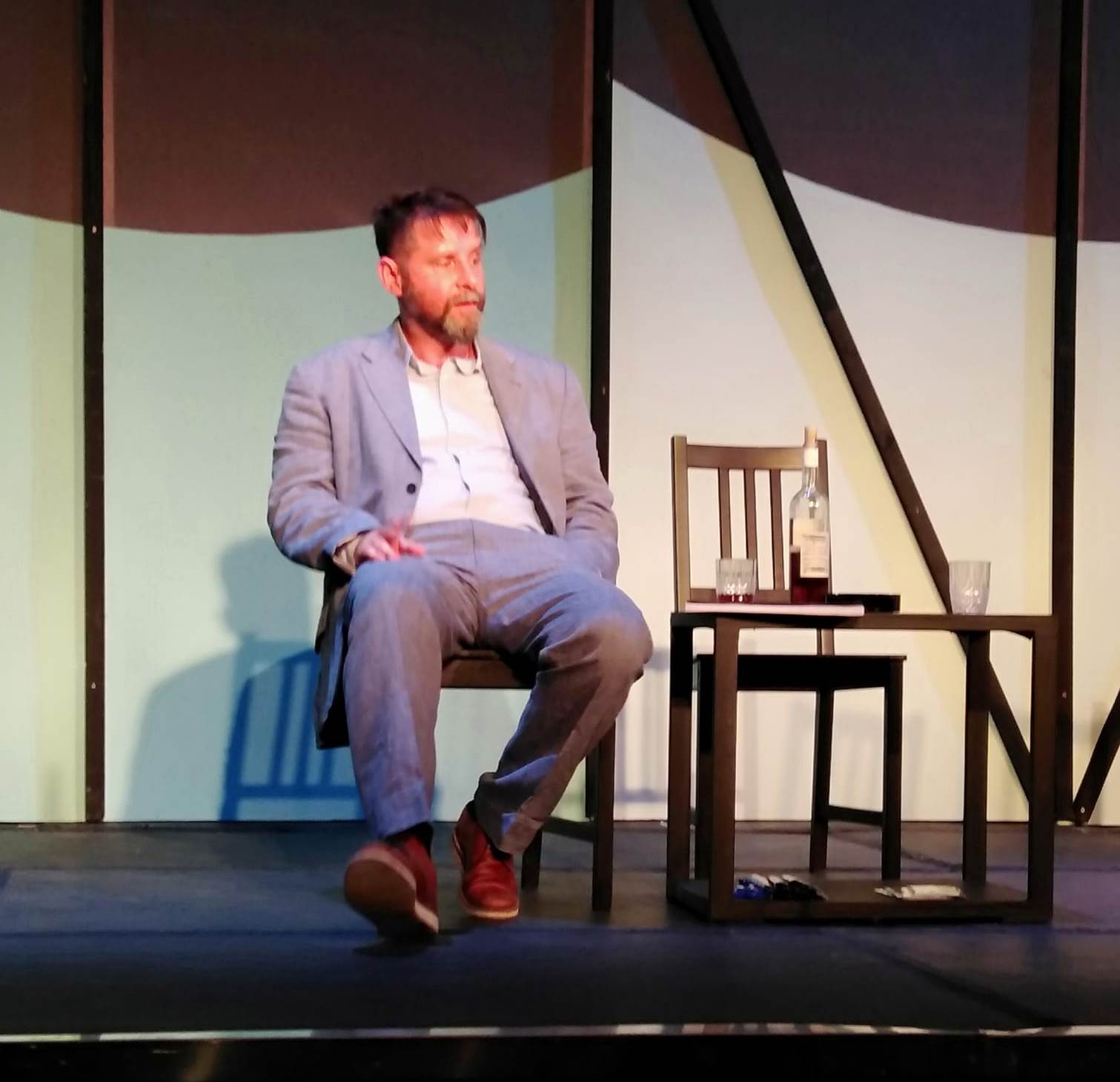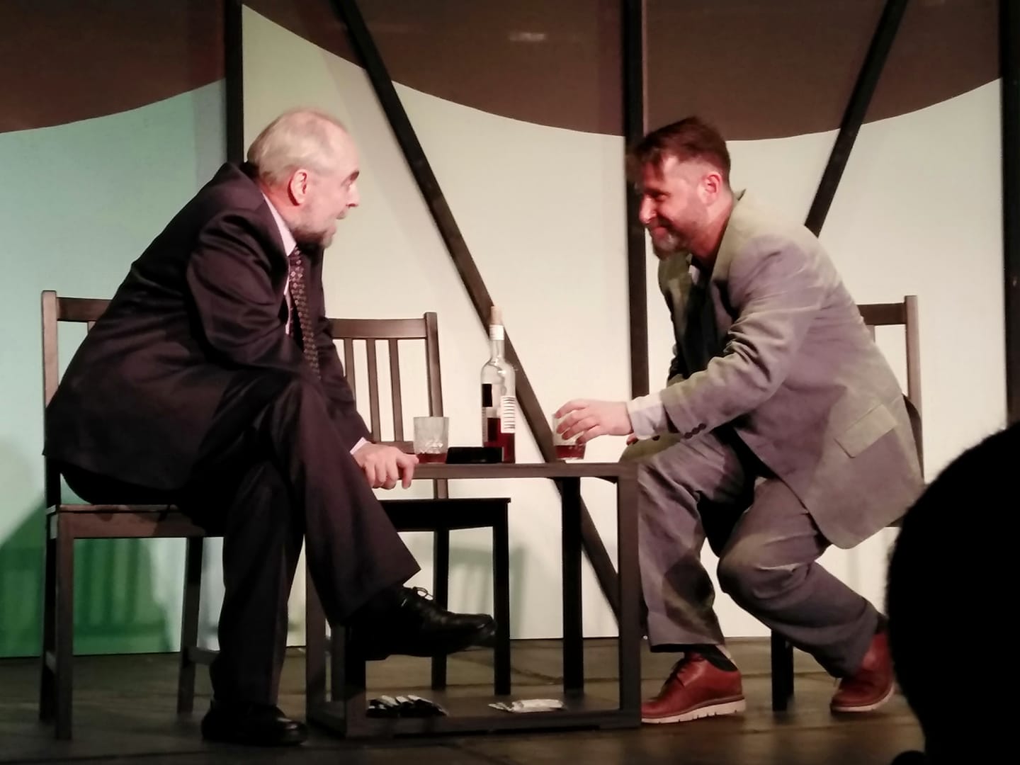 Τα σκηνικά της Έρσης Δρίνη, αρκετά λιτά, όσο επέτρεπε μια open air σκηνή, και οι εναλλασσόμενοι φωτισμοί του Αντώνη Παναγιωτόπουλου, εξυπηρετούσαν απόλυτα την ατμόσφαιρα του γραφείου του τραπεζίτη, που πολλές φορές τα ξεχνούσες, απορροφημένος από το man to man συναρπαστικό παιχνίδι του πρωταγωνιστικού ντουέτου.