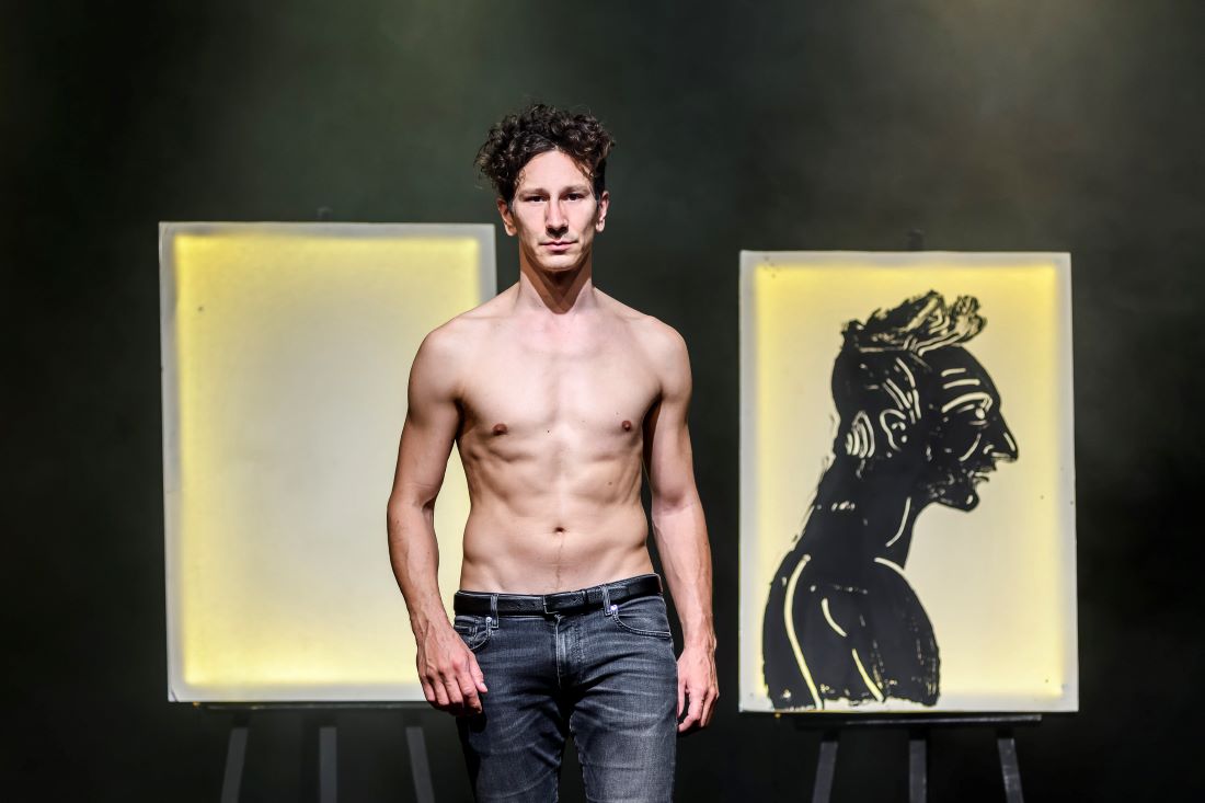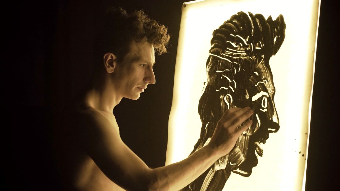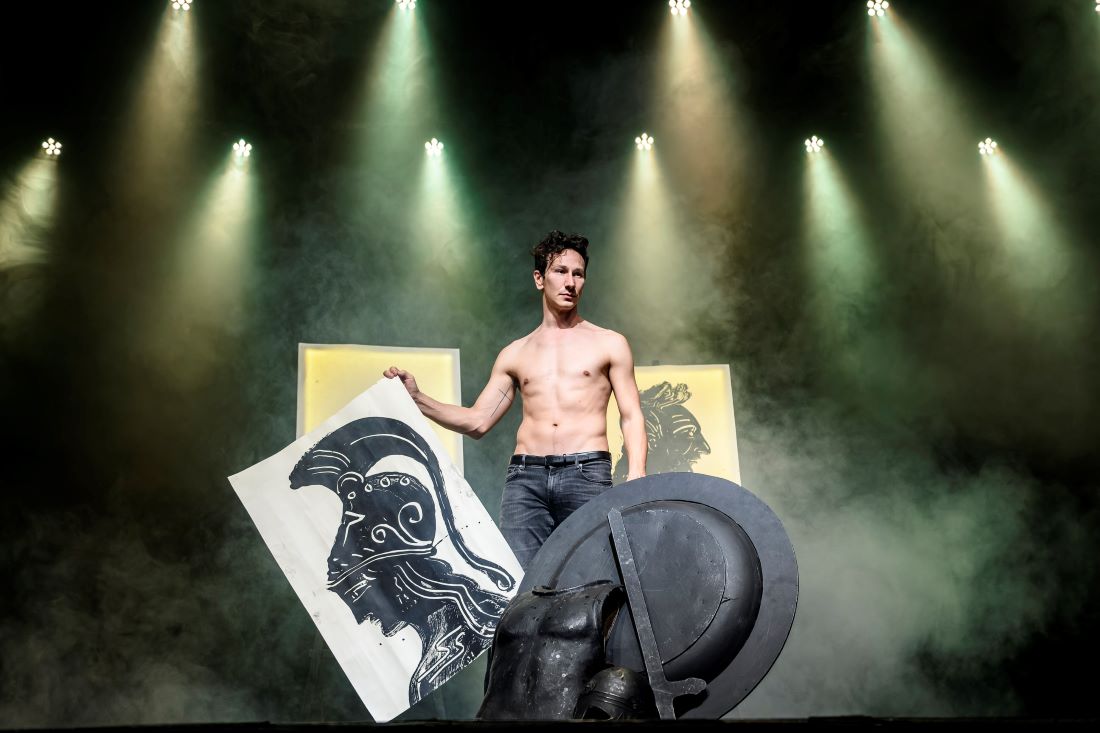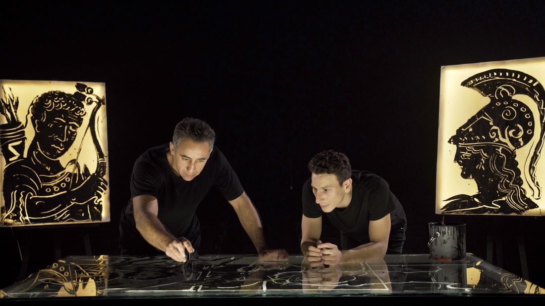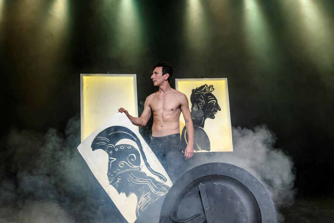 Ο Μιχάλης Σαράντης ερμηνεύει συγκλονιστικά και τους εννιά ρόλους της τραγωδίας συνομιλώντας με το ζωγραφικό σύμπαν του Απόστολου Χαντζαρά.