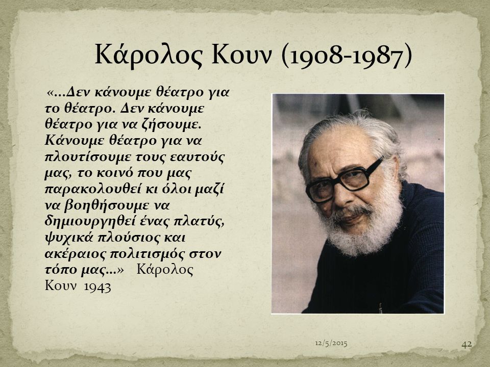 Το ελληνικό κοινό, χάρη στον Κουν, γνώρισε τα σύγχρονα ξένα θεατρικά ρεύματα, το θέατρο του «Παραλόγου», Ιονέσκο, Μαξ Φρις, Μπέκετ, Άλμπυ, Βάις, Πίντερ, Αραμπάλ, ενώ επανήλθε συχνά στους Ουίλλιαμς, Πιραντέλλο, Τσέχωφ, Μπρεχτ, Μίλλερ, Σαίξπηρ. Πρόβαλε το ελληνικό έργο μέσα από τον Βυζάντιο, Κορομηλά, Καπετανάκη, Ξενόπουλο και δημιούργησε νέους συγγραφείς: τον Καμπανέλλη, την Αναγνωστάκη, τον Κεχαΐδη, τον Σκούρτη, τον Μουρσελλά, τον Αρμένη.