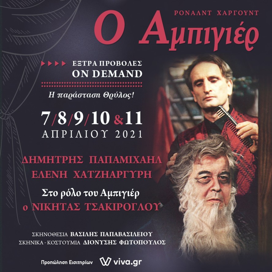 Οι θεατρικές επιχειρήσεις Λεμπέση – σε συνεργασία με την Music & Drama productions – παρουσιάζουν για ακόμα μία φορά κατόπιν επιτυχίας και παράκλησης του κοινού σε  έξτρα  ON DEMAND προβολές  στις 7,8,9,10 και 11 Απριλίου, την παράσταση θρύλο « Ο Αμπιγιέρ» του Ρόναλντ Χάργουντ, που ήρθε για να μείνει, με μία πλειάδα κορυφαίων συντελεστών, που ο καθένας στο είδος του σημείωσαν και σημειώνουν μεγάλες επιτυχίες.