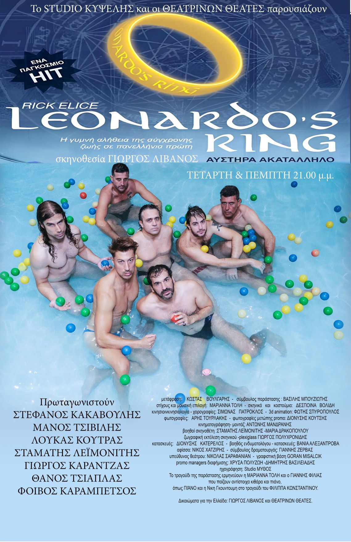 Το πολύκροτο θεατρικό του βραβευμένου με τέσσερα Tony Awards Rick Elice «LEONARDO’ S RING», ένα από τα σημαντικότερα σύγχρονα μοντέρνα θεατρικά κείμενα επιστρέφει στην Ελλάδα από την Ομάδα Θεατρίνων Θεατές στο Studio Κυψέλης, γεγονός που χαιρέτησε με ενθουσιασμό ο ίδιος ο συγγραφέας! Αποτελεί τη μεγαλύτερη εμπορικη επιτυχία pocket theater στην Ελλάδα και μια απο τις μεγαλύτερες καλλλιτεχνικές. Παίχθηκε τρία χρόνια και επιστρέφει στο σπίτι του!