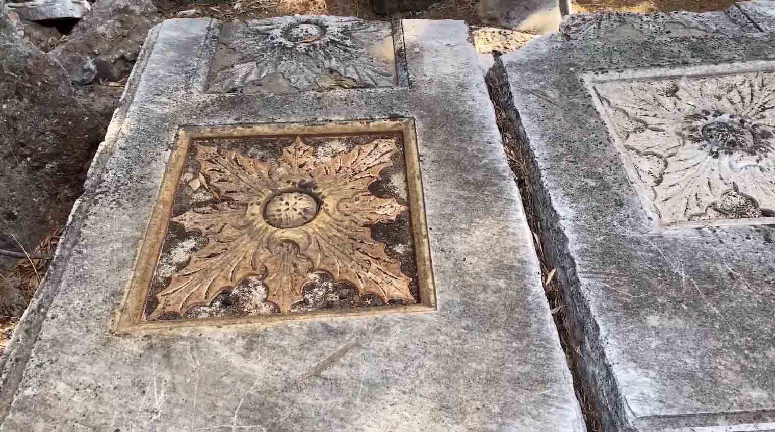 Ένα μοναστηριακό τραπέζι στον κήπο με φόντο τις υστεροβυζαντινές κολώνες και τις επιτύμβιες πλάκες.