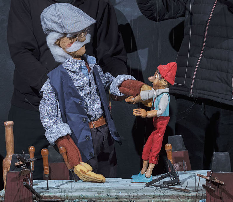 Η παράσταση είναι μία μεταφορά του κλασσικού αριστουργήματος του Κάρλο Κολλόντι σε θέατρο με διάφορα είδη κούκλας όπως μαριονέτες, γιαγαντόκουκλες, μαρόττες κλπ.