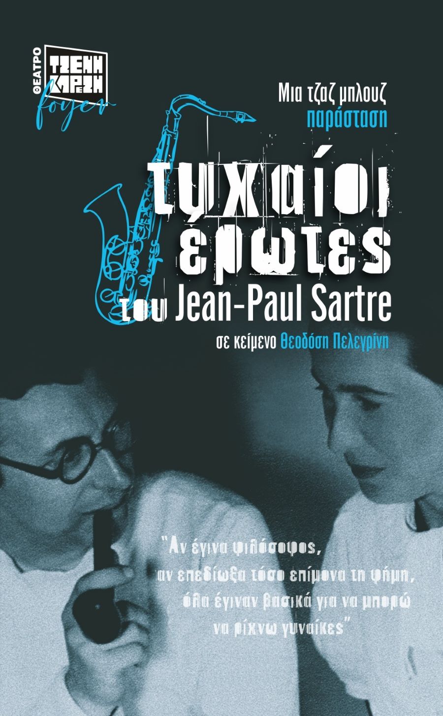 Το νέο έργο του Θεοδόση Πελεγρίνη «Τυχαίοι Έρωτες» και με πρώτο τον κορυφαίο Υπαρξιστή Ζαν Πωλ Σαρτρ, από 21 Ιανουαρίου στο φουαγιέ του Θεάτρου Τζένη Καρέζη, στο πλαίσιο του νέου εναλλακτικού κύκλου παραστάσεων με μουσική, φαντασία, στοχασμό, φιλοσοφία, χιούμορ.